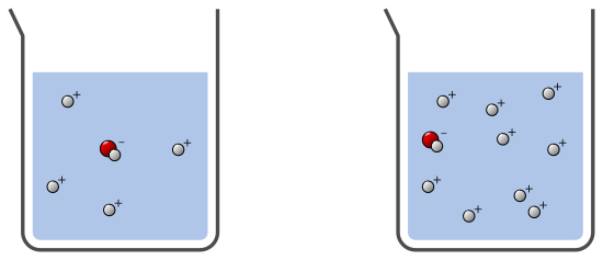 Dans l’exemple suivant, les deux solutions sont acides, il y a plus d’ions H+ que HO–. Par contre, la solution de droite est plus acide que celle de gauche car pour un même volume, il y a plus d’ions H+ dans la solution de droite :